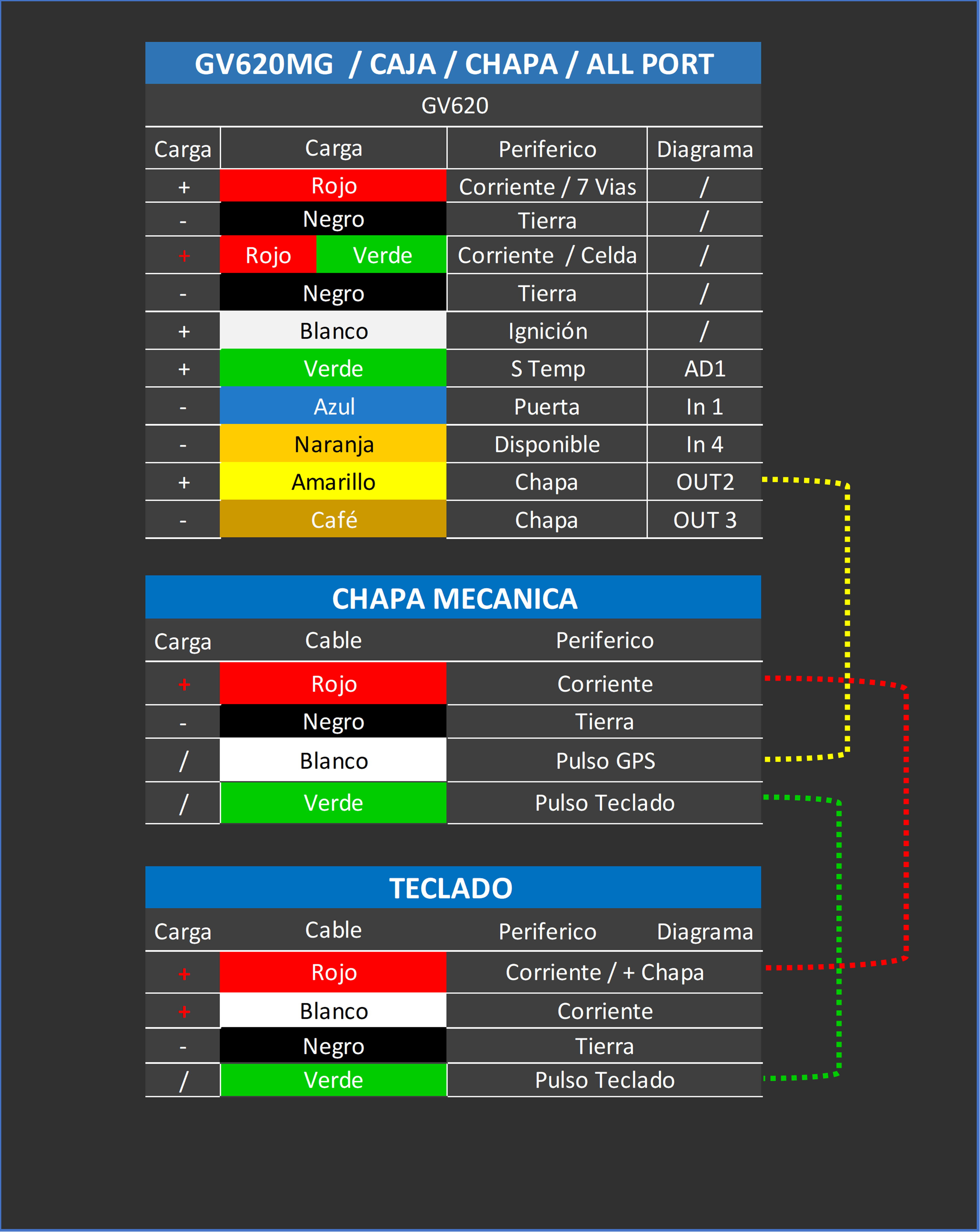 Puertos: AT+GTAIS=gv600mg,1,4,0,0,1,,0,0,0,0,1,,,,,,,,,,,,,,,10,30,10,20,0,FFFF$ Activar Temperatura Analógico:Salida 2 Chapa/Quinta: Activar Salida 2 GV620mg AT+GTOUT=gv600mg,,,,1,0,0,,,,,,,F,0,0,0,0,FFFF$Desactivar Salida 2 GV620mg AT+GTOUT=gv600mg,,,,0,0,0,,,,,,,F,0,0,0,0,FFFF$Salida 3 Disponible: Activar Salida 3 GV620mg AT+GTOUT=gv600mg,,,,,,,1,0,0,,,,F,0,0,0,0,FFFF$Desactivar Salida 3 GV620mg AT+GTOUT=gv600mg,,,,,,,0,0,0,,,,F,0,0,0,0,FFFF$Cerrado Automatico Chapa. AT+GTCMD=gv620mg,1,1,AT+GTOUT=gv620mg,,,,0,0,0,,,,,,,F,0,0,0,0,FFFF$,,,,,FFFF$ AT+GTUDF=gv620mg,1,1,0000000000100000,60,00000,00000,00000002,0,0,0,,,FFFF$