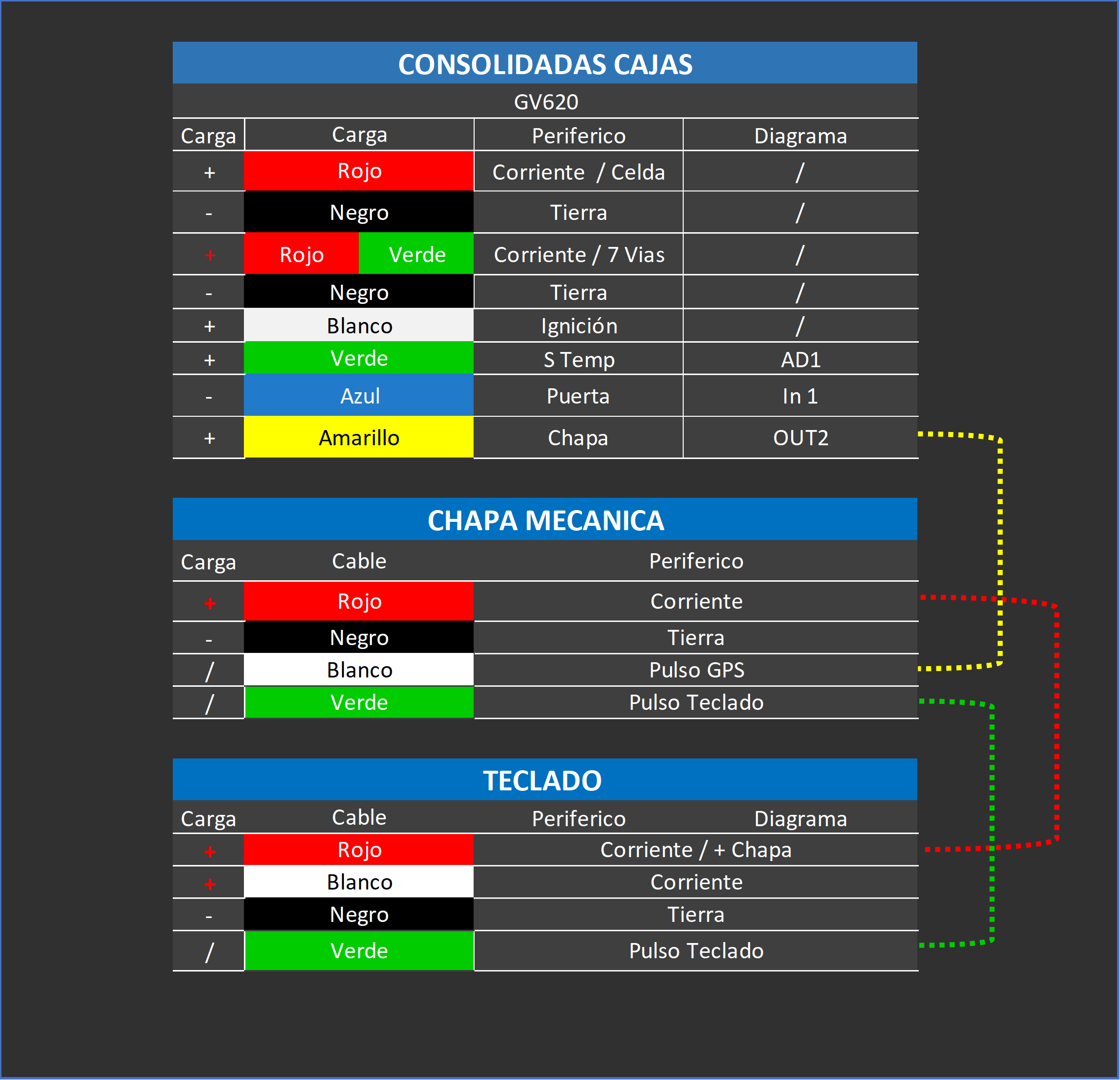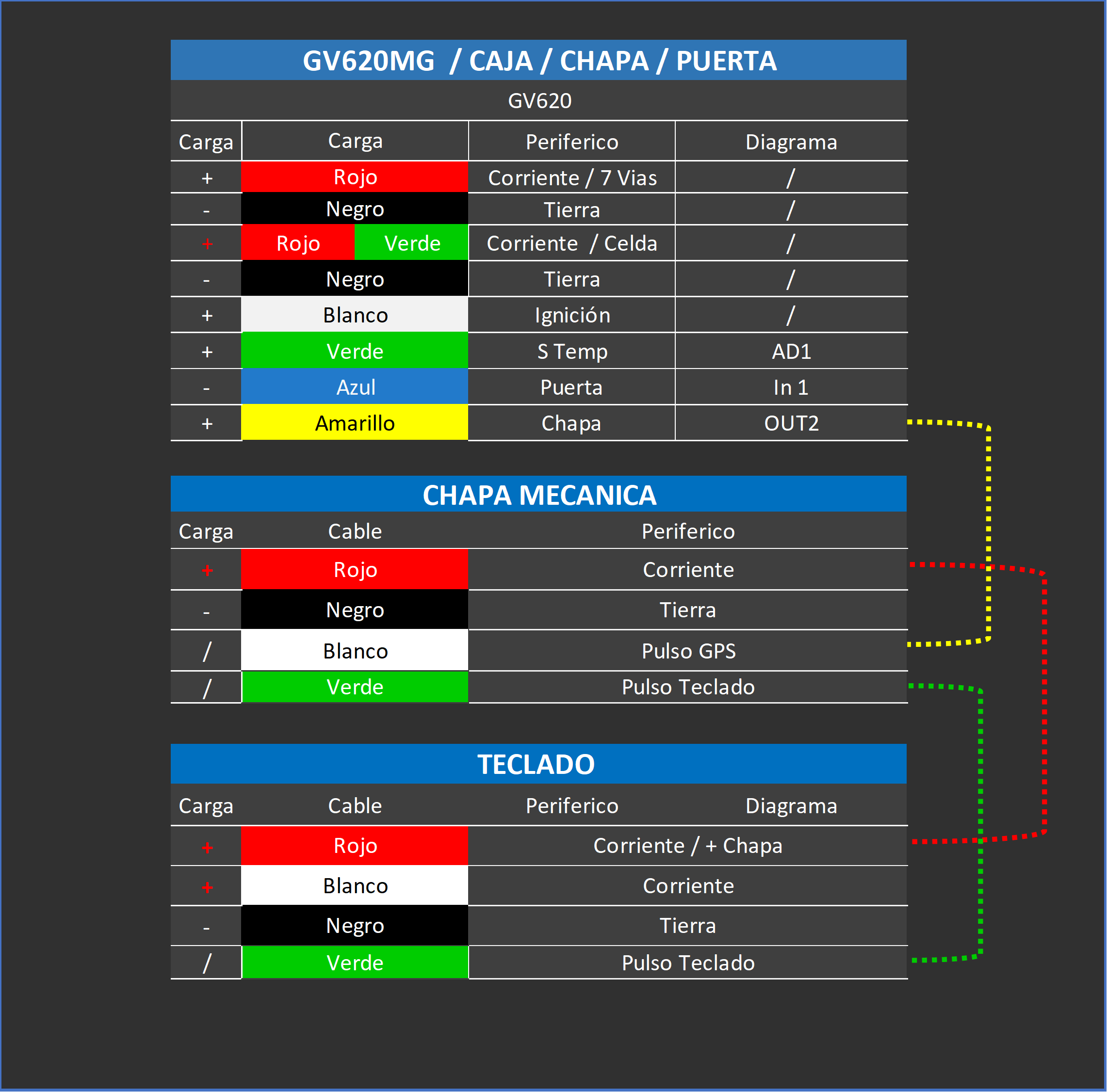 Puertos: AT+GTAIS=gv600mg,1,4,0,0,1,,0,0,0,0,1,,,,,,,,,,,,,,,10,30,10,20,0,FFFF$ Activar Temperatura Analógico:Salida 2 Chapa/Quinta: Activar Salida 2 GV620mg AT+GTOUT=gv600mg,,,,1,0,0,,,,,,,F,0,0,0,0,FFFF$Desactivar Salida 2 GV620mg AT+GTOUT=gv600mg,,,,0,0,0,,,,,,,F,0,0,0,0,FFFF$Salida 3 Disponible: Activar Salida 3 GV620mg AT+GTOUT=gv600mg,,,,,,,1,0,0,,,,F,0,0,0,0,FFFF$Desactivar Salida 3 GV620mg AT+GTOUT=gv600mg,,,,,,,0,0,0,,,,F,0,0,0,0,FFFF$Cerrado Automatico Chapa. AT+GTCMD=gv620mg,1,1,AT+GTOUT=gv620mg,,,,0,0,0,,,,,,,F,0,0,0,0,FFFF$,,,,,FFFF$ AT+GTUDF=gv620mg,1,1,0000000000100000,60,00000,00000,00000002,0,0,0,,,FFFF$